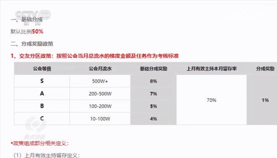 主播得到的打賞,平臺和經(jīng)紀(jì)機(jī)構(gòu)都會參與分成。一般來說,平臺要首先分走50%的打賞費(fèi)用,剩下的由主播和經(jīng)紀(jì)機(jī)構(gòu)來分。從某平臺與主播經(jīng)紀(jì)公司的后臺約定中可以看出,當(dāng)月總流水的梯度金額及任務(wù)作為考核。經(jīng)紀(jì)機(jī)構(gòu)月流水超過500萬元,至少可以額外拿到8%的獎勵。在這種制度的激勵下,就推動經(jīng)紀(jì)公司和主播想方設(shè)法爭取更高額度的打賞。