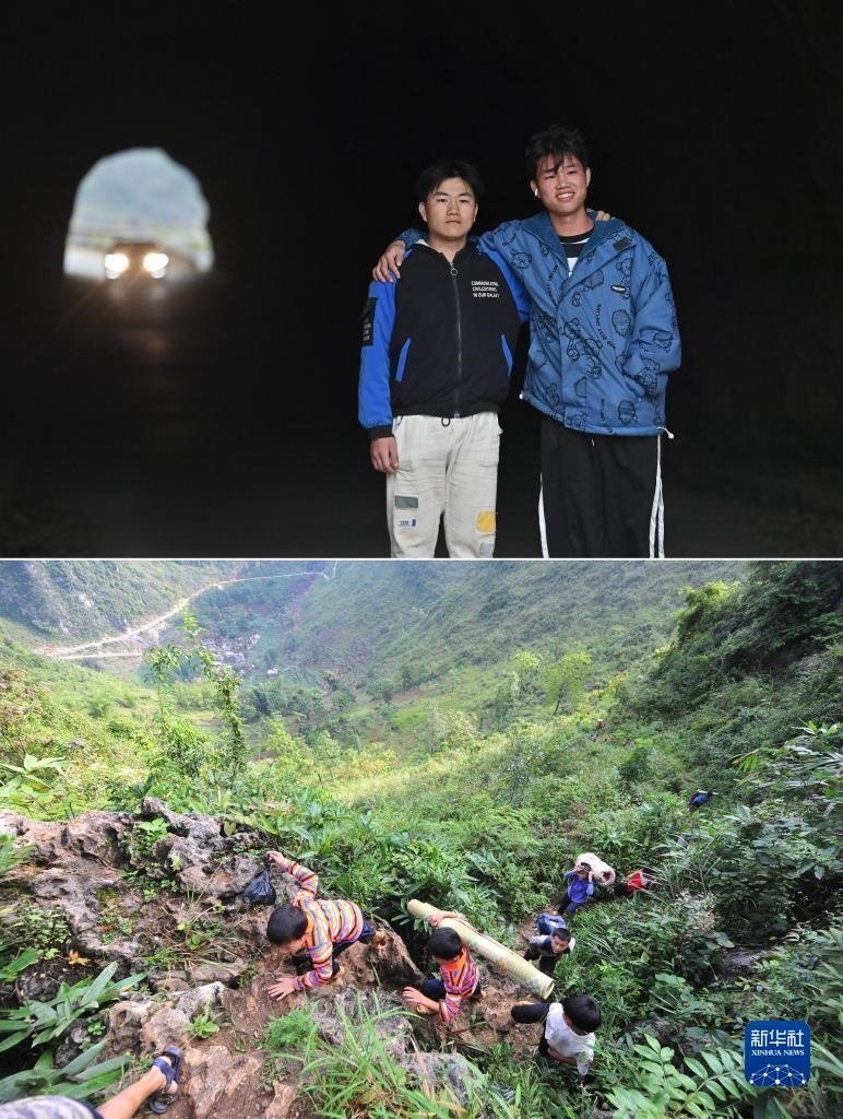 拼版照片:上圖為2023年1月20日,在大化瑤族自治縣板升鄉(xiāng)弄勇村,22歲的蒙宣任(左)和弟弟蒙宣汰站在通往弄勇小學(xué)的隧道旁合影,隧道上方是他們兒時(shí)上學(xué)需要攀爬的“天梯”;下圖為2012年9月3日,在大化瑤族自治縣板升鄉(xiāng)弄勇村,蒙宣汰(左一)、蒙宣任(左二)爬山路去學(xué)校。蒙宣任目前在遼寧省交通高等專(zhuān)科學(xué)校讀書(shū),弟弟蒙宣汰從技校畢業(yè)后在廣東一家汽修廠(chǎng)上班。