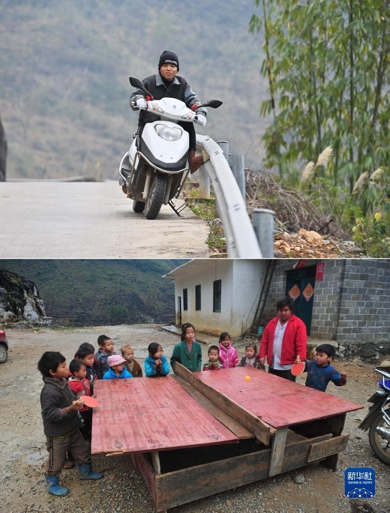 拼版照片:上圖為2023年1月26日,在大化瑤族自治縣板升鄉(xiāng)弄勇村,在廣東工作、返鄉(xiāng)過(guò)年的蒙宣海在路邊休息;下圖為2012年12月27日,在弄勇村弄頂教學(xué)點(diǎn),7歲的蒙宣海(右一)在打乒乓球。2022年,蒙宣海技校畢業(yè)后,選擇去廣東工作。