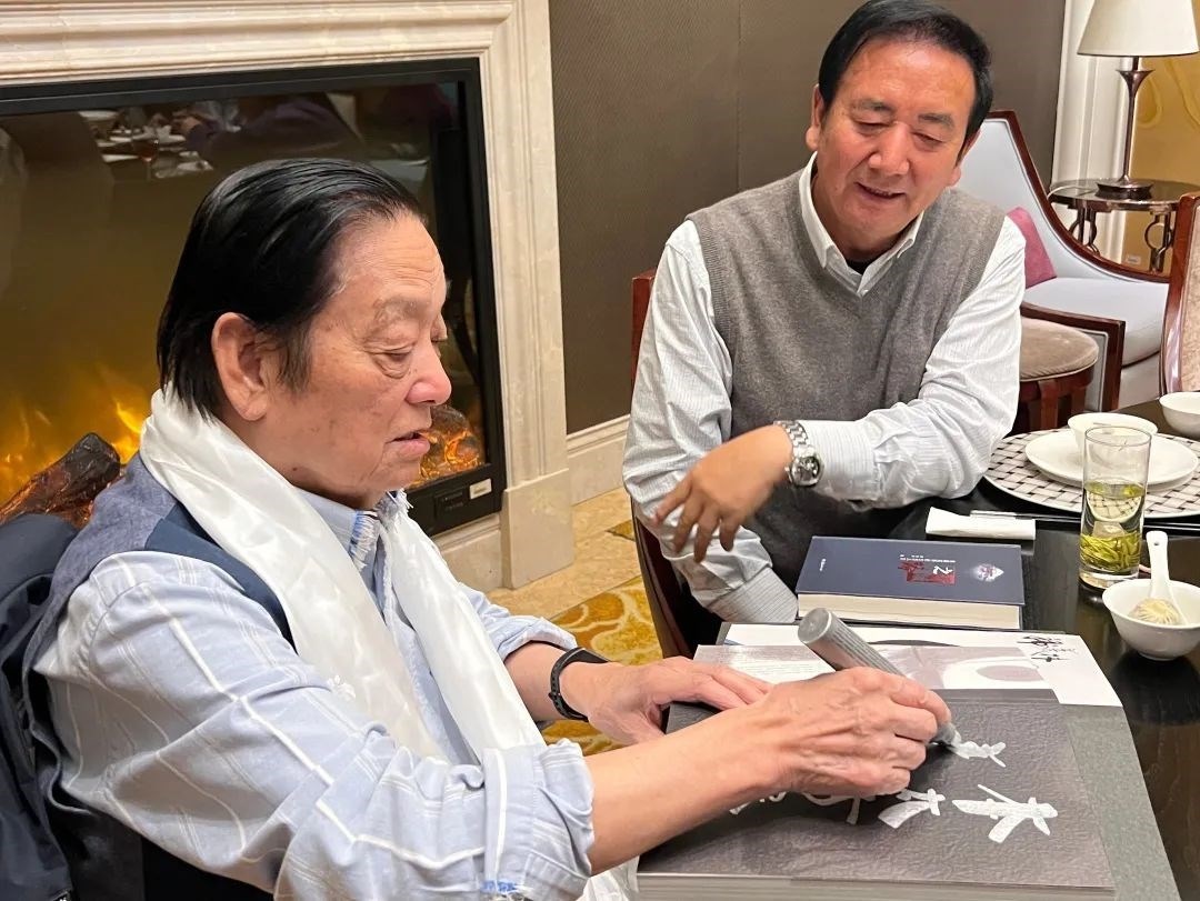 ▲韓美林為原青海省第十二屆人大常委會黨組副書記,現(xiàn)三江源生態(tài)保護基金會理事長鄧本太簽書留念