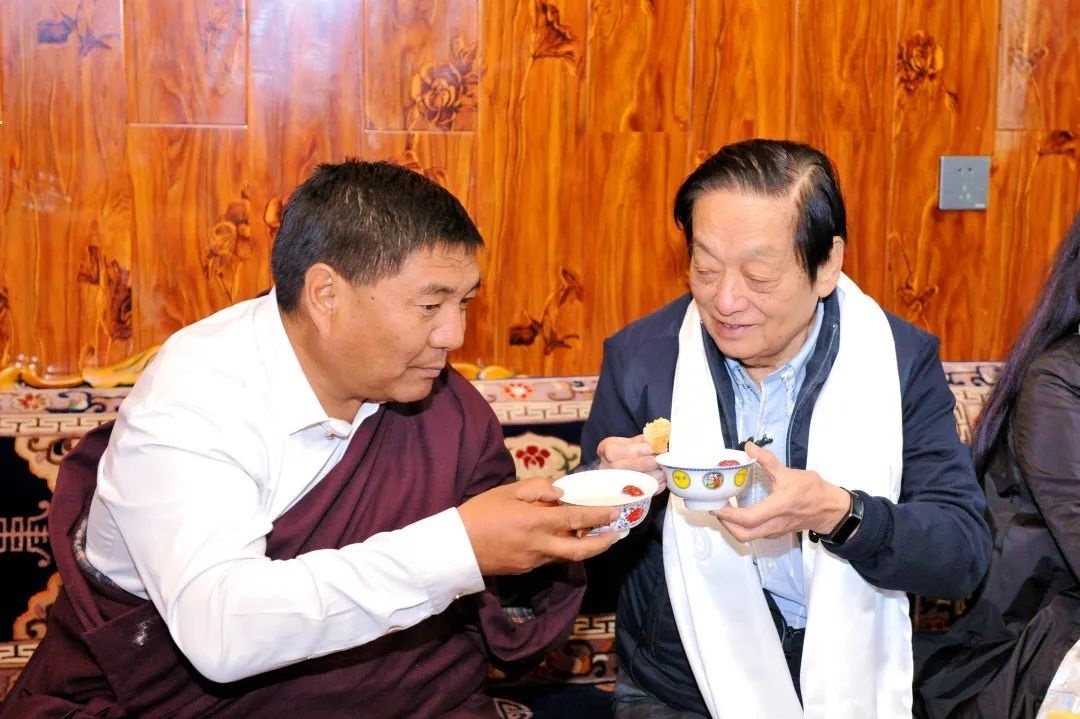 潔白的哈達、香氣撲鼻的奶茶和軟糯的糌粑,無不讓一行人從心底升騰起暖意和感動。韓美林用藏文簽下他們的名字將畫冊送給二人,韓美林說:“我是畫畫的,也許你們對藝術創(chuàng)作并不熟悉,但我得感謝你們,沒有你們世世代代守衛(wèi)著這片土地上的生命美好,我們的一切創(chuàng)作源泉都無從談起,說到對自然的理解,對生命的尊敬,對傳統(tǒng)的延續(xù),所有人都得向你們學習?!蹦撩穹驄D雖然漢語沒有那么流利,但看著畫冊里精美的作品,愛不釋手,并為韓老師能寫如此準確美麗的藏文而驚訝,直到臨別還不停地用送上哈達的手勢為藝術大篷車祝福。
