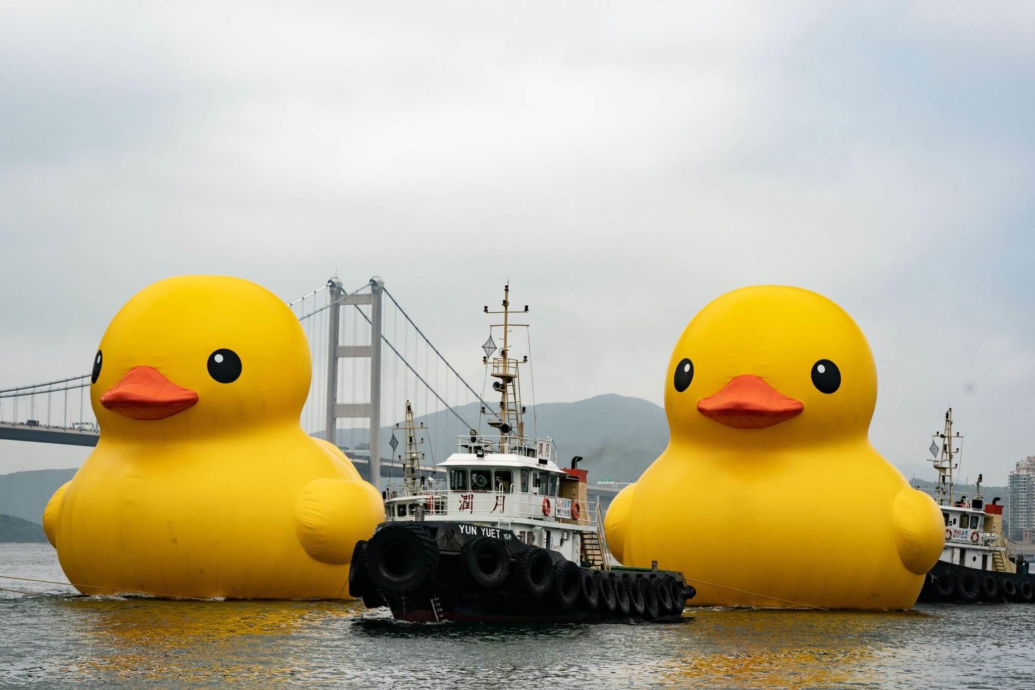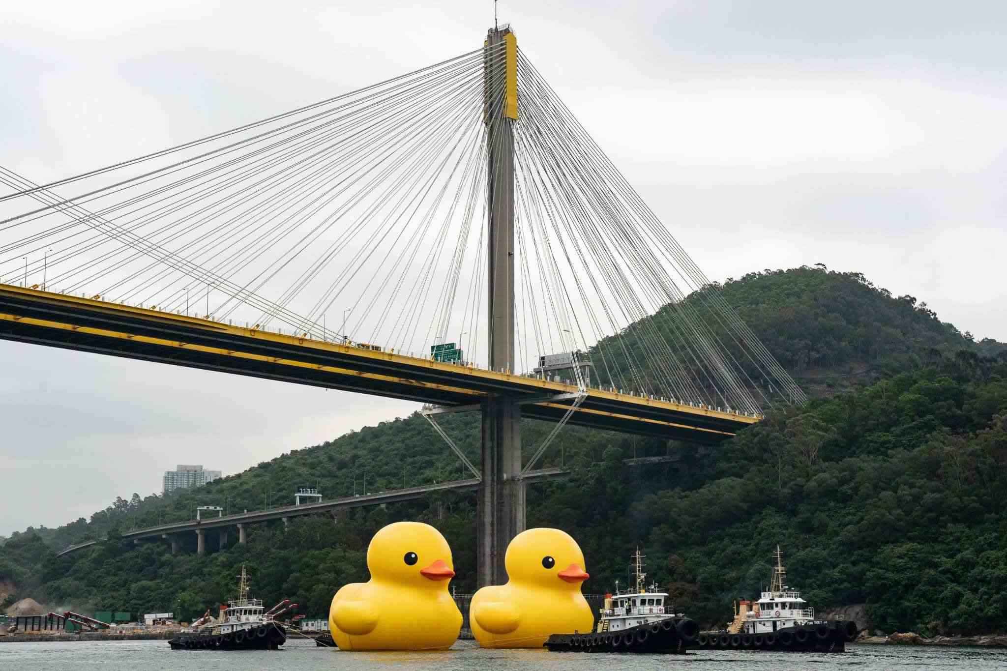 2023年5月25日,香港,兩只18米高的巨型橡皮鴨現(xiàn)身于青衣海域,引市民關(guān)注。視覺(jué)中國(guó)