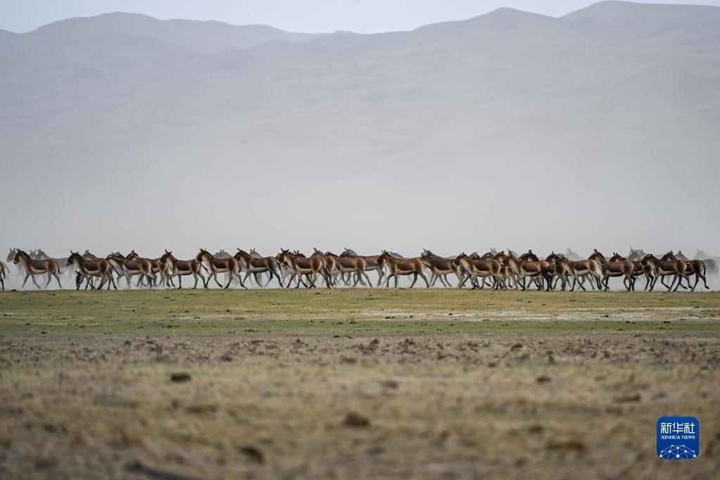 一群藏野驢在阿爾金山國(guó)家級(jí)自然保護(hù)區(qū)奔跑(5月23日攝)。