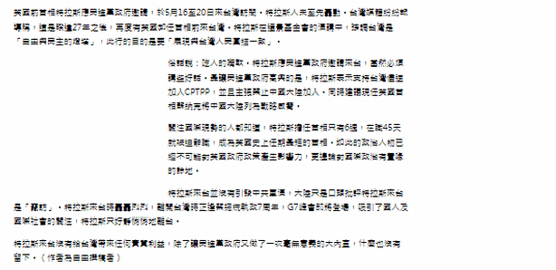 這兩天,譚主發(fā)現臺灣中時新聞網刊發(fā)了一篇快評文章:《特拉斯悄悄走了》。文章說到:特拉斯來臺沒有給臺灣帶來任何實質利益,除了讓民進黨當局又做了一次毫無意義的大內宣,什么也沒有留下。