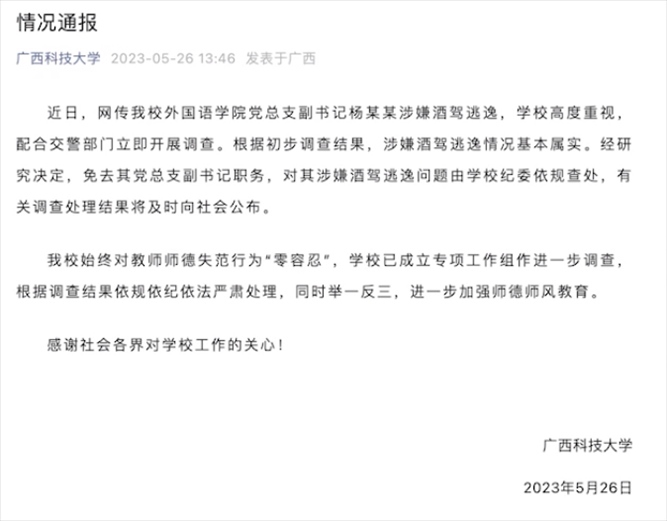 ·廣西科大通報(bào)學(xué)院副書(shū)記涉酒駕逃逸:免職,學(xué)校紀(jì)委介入。