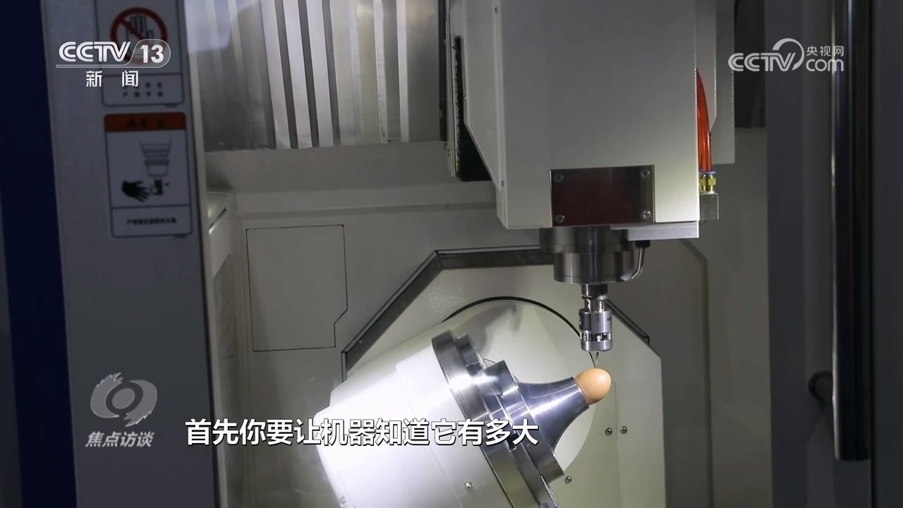 北京中關(guān)村精雕智造科技創(chuàng)新中心副總經(jīng)理楊錳:“一個是識別,給機床安上了一雙眼睛,能知道雞蛋長什么樣子;另外一個就是要求機床精度和穩(wěn)定性非常高,保證雞蛋永遠(yuǎn)刻不爛、刻不破?!?/p>