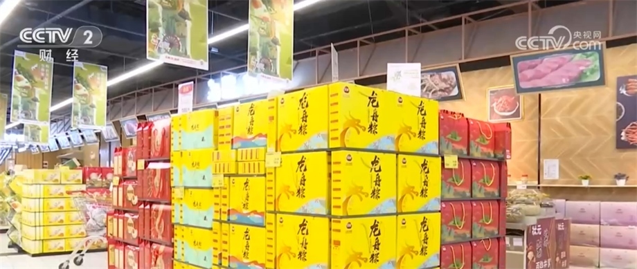 江蘇南京某超市食品銷售部經理 周雯:今年各品牌推出了大黃米粽,它跟之前的粽子相比比較軟和比較糯,端午前兩周和前一周是高峰期,端午當天會是銷售的峰值。