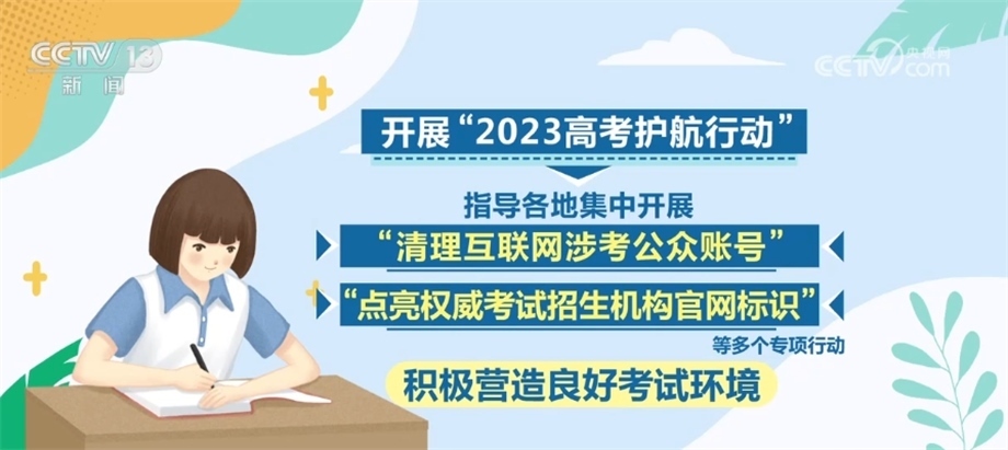 此外,將繼續(xù)開展“2023高考護航行動”,指導各地集中開展“清理互聯(lián)網(wǎng)涉考公眾賬號”“點亮權(quán)威考試招生機構(gòu)官網(wǎng)標識”等多個專項行動,積極營造良好考試環(huán)境。
