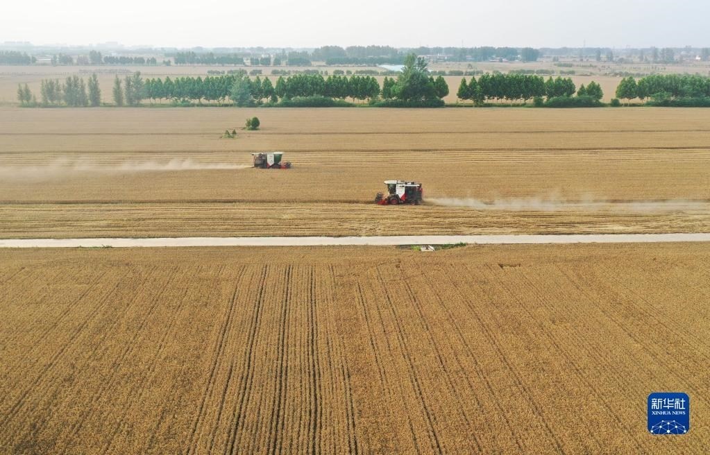 6月1日,在河南省駐馬店市上蔡縣邵店鎮(zhèn)劉岳村,收割機(jī)在搶收小麥。新華社記者 張浩然 攝