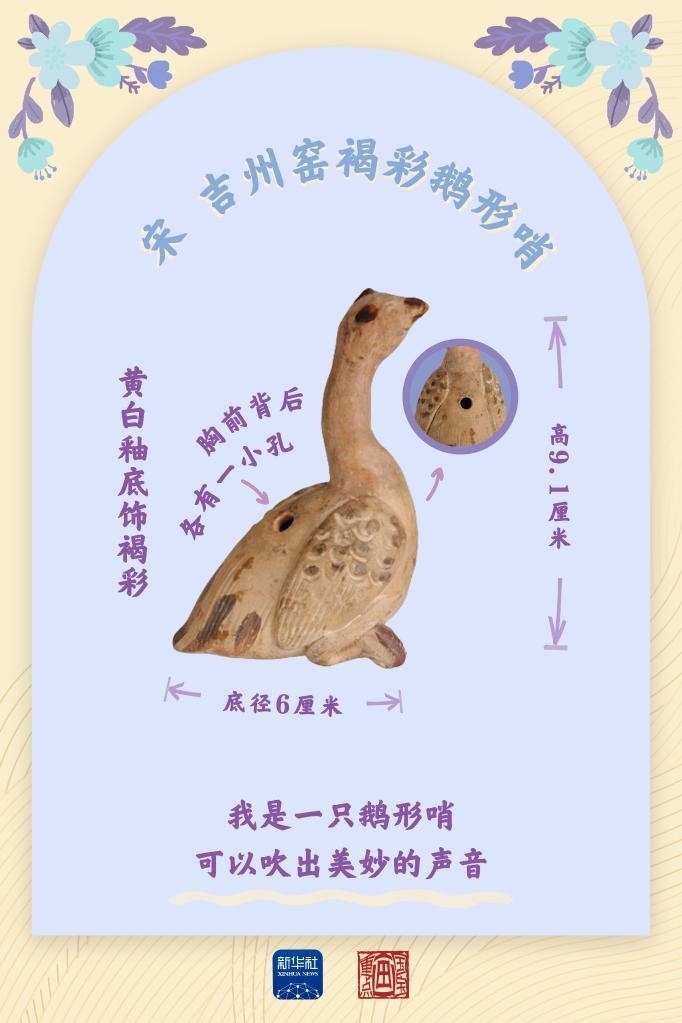 鵝形哨出土于江西吉安的宋代吉州窯遺址。吉安市博物館館長李希朗說,吉州窯的瓷土粗松,有近似于陶的特點(diǎn),可塑性較強(qiáng)。這里出土的瓷塑大多不超過10厘米,動(dòng)物瓷塑的原型多為社會(huì)生活中所常見。從出土的瓷塑數(shù)量來看,吉州窯當(dāng)年的訂單量很大,頗受市場(chǎng)歡迎。也許每一只鵝形哨的背后,都有一名鼓著腮幫子的稚童。歷經(jīng)時(shí)光荏苒,鵝形哨到今天還能發(fā)出動(dòng)聽的哨音。