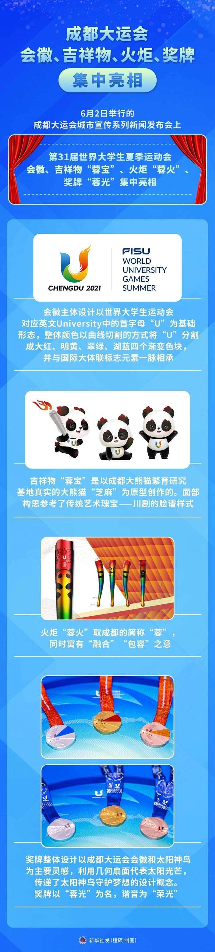 新華社成都6月2日電(記者董小紅、陳地)2日舉行的成都大運會城市宣傳系列新聞發(fā)布會上,第31屆世界大學(xué)生夏季運動會會徽、吉祥物“蓉寶”、火炬“蓉火”、獎牌“蓉光”集中亮相。