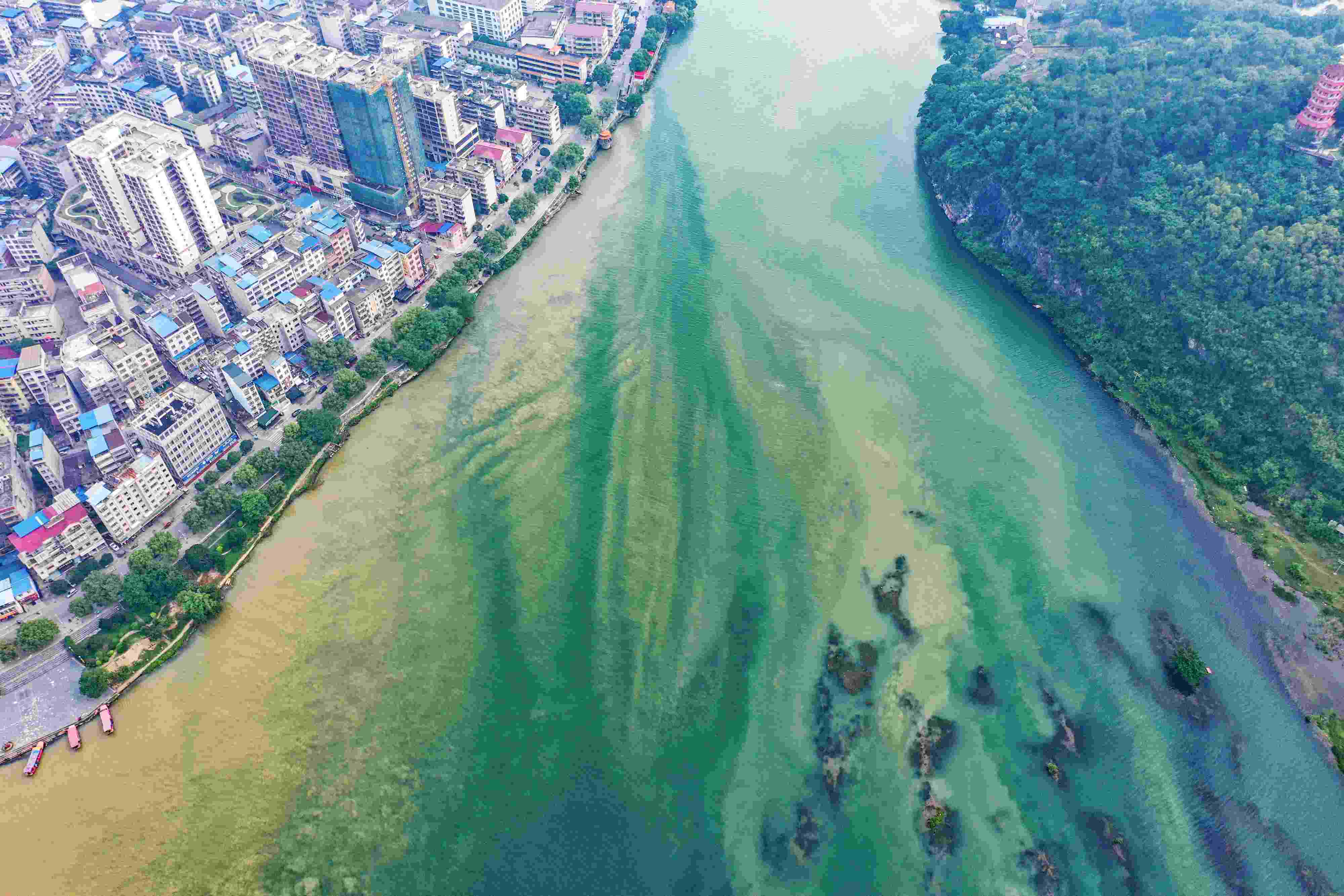 2023年6月4日,受降雨影響,廣西桂林全州縣城湘江河段出現(xiàn)涇渭分明景觀??罩懈╊?,湘江支流萬(wàn)鄉(xiāng)河混濁的河水繞城匯入清澈的湘江干流,交匯之處涇渭分明。 視覺(jué)中國(guó)