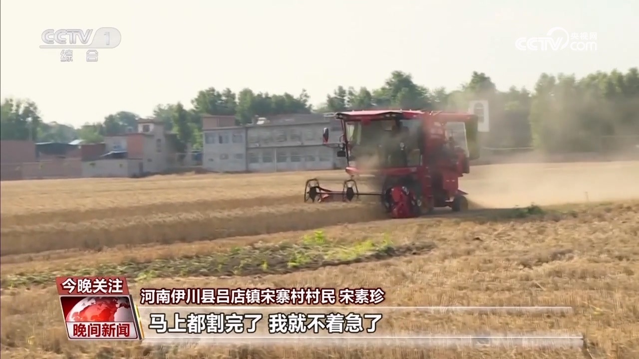 伊川縣呂店鎮(zhèn)宋寨村村民 宋素珍:前幾天下雨小麥?zhǔn)詹换貋?lái),心里可心慌,鄉(xiāng)里派履帶式收割機(jī),我這十幾畝地馬上都挨住(輪到)了,馬上都割完了,我就不著急了。