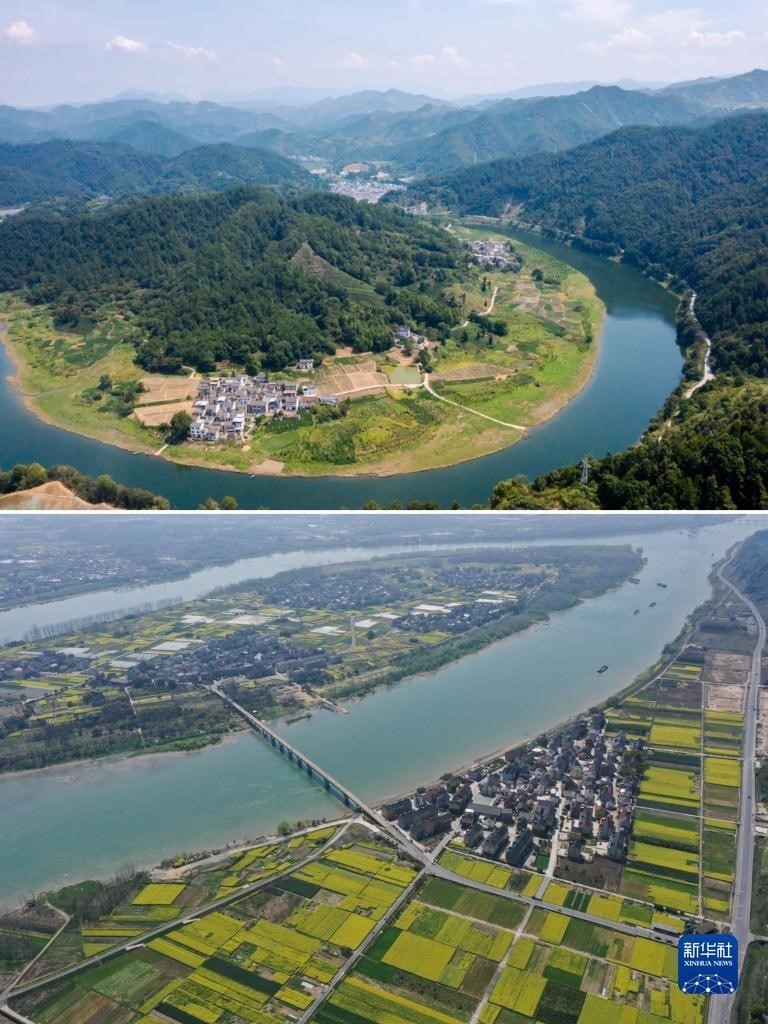 拼版照片:左圖為6月1日拍攝的安徽省黃山市歙縣新安江風(fēng)景(新華社記者張端攝);右圖為2020年9月6日拍攝的浙江省桐廬縣蘆茨村一景(無人機(jī)照片,新華社記者黃宗治攝)。