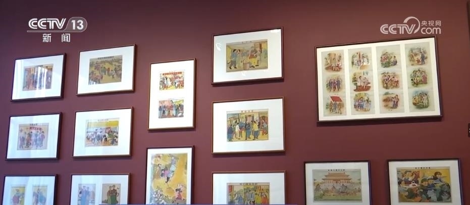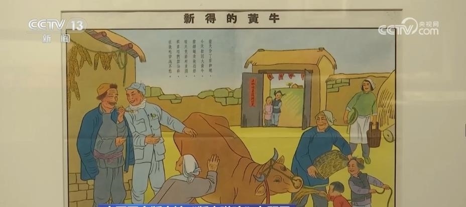 跟隨著講解員,再往前走,國(guó)家版本館的特色館藏——年畫、連環(huán)畫和宣傳畫出現(xiàn)在眼前。這面墻上和展柜集中展出了47幅新中國(guó)成立初期的新年畫。畫家李可染在1950年創(chuàng)作的《新得的黃牛》等作品,展現(xiàn)出老百姓感受到新中國(guó)新生活的幸福和美好。