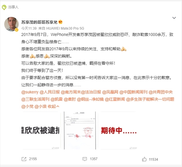 ·索要千萬逼死丈夫?WePhone開發(fā)者蘇享茂家屬:翟欣欣涉嫌敲詐勒索已被逮捕。