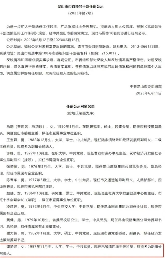 ·中共昆山市委組織部干部監(jiān)督科回應(yīng)97年出生女子擬提名副鎮(zhèn)長:是按正常流程進(jìn)行,有問題可以監(jiān)督舉報(bào)。
