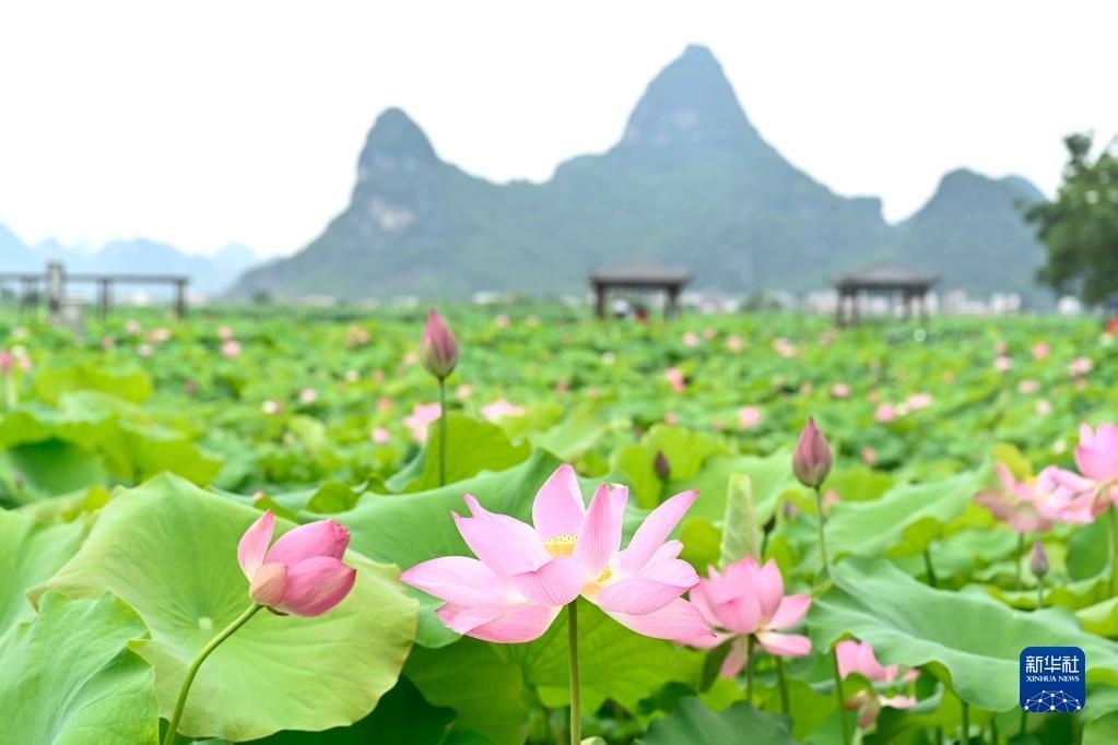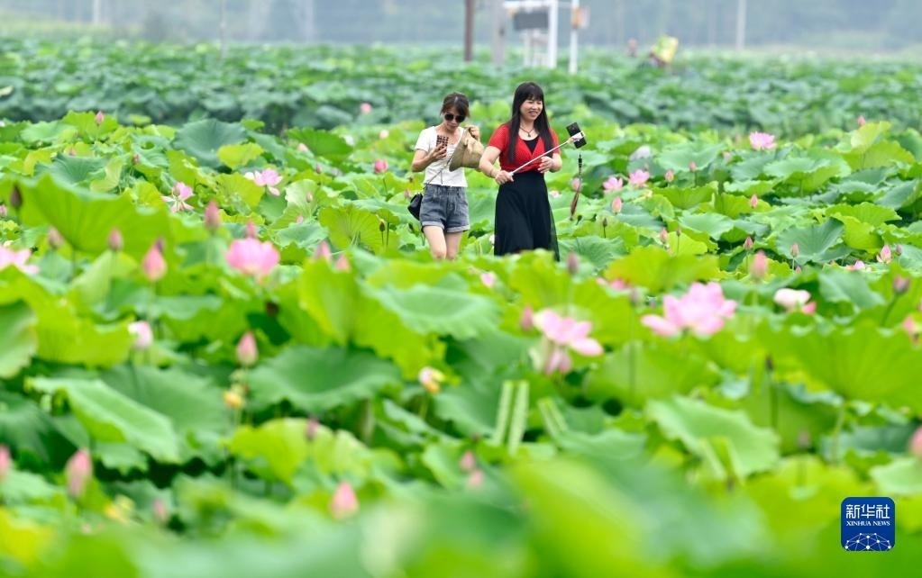 時(shí)下,廣西柳州市柳江區(qū)百朋鎮(zhèn)萬畝荷塘里的各色荷花競(jìng)相綻放,吸引游客前來賞花游玩。新華社發(fā)(黎寒池 攝)