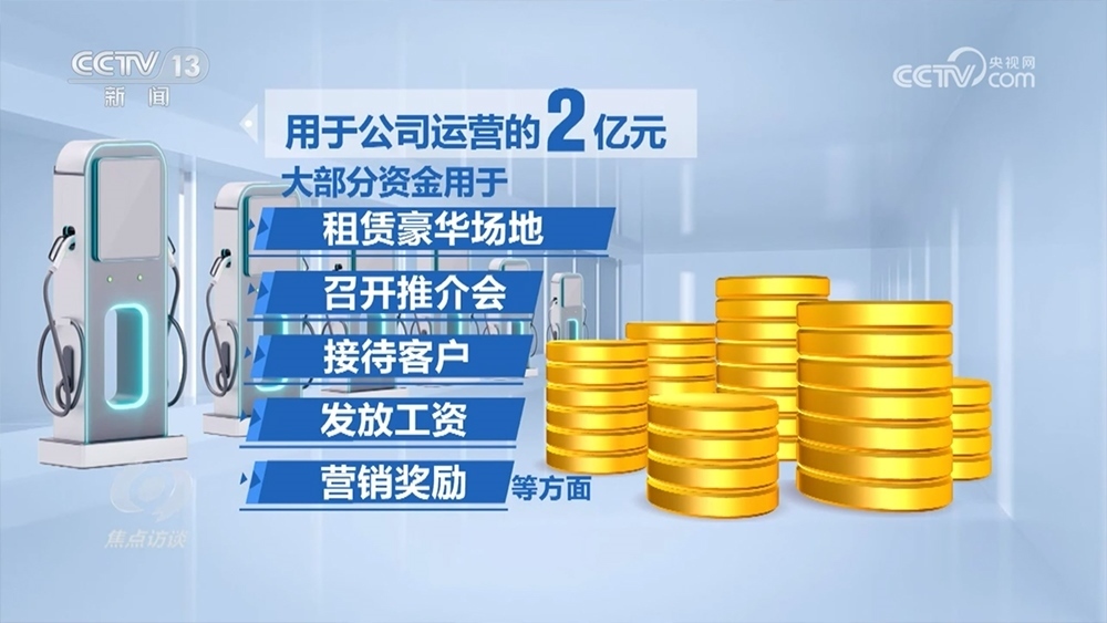 用于公司運(yùn)營(yíng)的2億元,大部分資金用于租賃豪華場(chǎng)地、召開推介會(huì)、接待客戶、發(fā)放工資、營(yíng)銷獎(jiǎng)勵(lì)等方面。實(shí)際僅修建充電樁123個(gè),用資僅1000多萬元,僅占資金總額的1%。