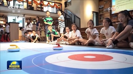 在紹興竹田頭村,偏遠(yuǎn)村落的孩子們正在新建的農(nóng)家書屋里體驗冰壺課。