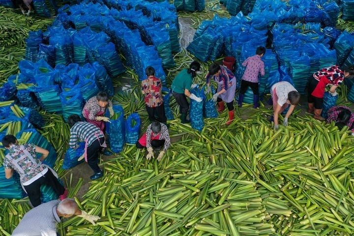 在浙江省麗水市景寧畬族自治縣大漈鄉(xiāng)大漈村茭白交易市場(chǎng),村民將新收割的茭白打包冷藏(2021年8月25日攝,無(wú)人機(jī)照片)。