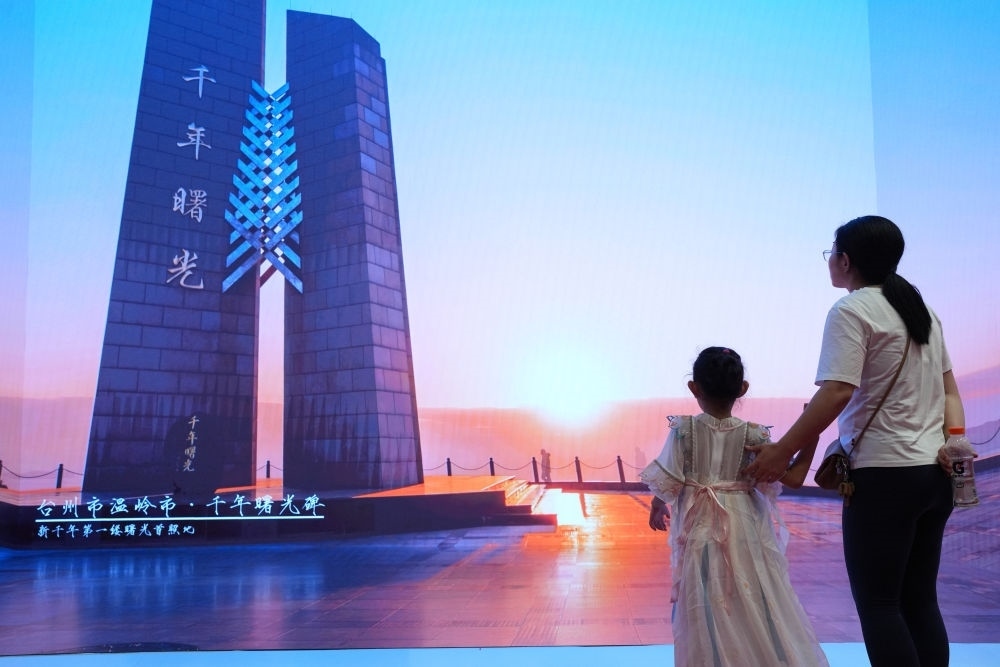 一對(duì)母女在杭州舉行的大道之行——“八八戰(zhàn)略”實(shí)施20周年大型主題展覽上觀看展示浙江建設(shè)成就的視頻(2023年9月9日攝)。新華社記者 翁忻旸 攝