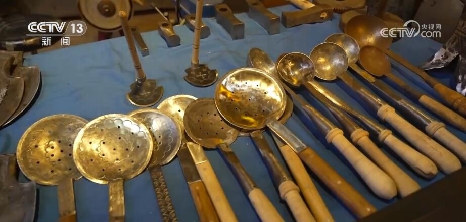總臺(tái)記者 劉菲:如今的古城最吸引人們的并非熱鬧的商業(yè)街,而是一個(gè)個(gè)非物質(zhì)文化遺產(chǎn)的手工制作,現(xiàn)在在古城里有20多種的非遺制作。在很多年前我曾經(jīng)來過這里,這里就是一個(gè)小小的鐵匠鋪,而如今再來到這兒,已經(jīng)變成了一個(gè)打鐵技藝的展示館。小到一個(gè)湯勺,大到生產(chǎn)農(nóng)具,聽著這打鐵的聲音,也仿佛把我?guī)Щ亓水?dāng)年。