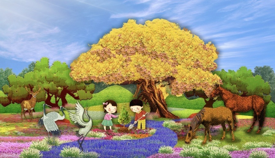 4,東單西北角的“和諧共生”花壇頂高8.5米,“三北工程”綠色長(zhǎng)城為主景,配以野馬(西北)、麋鹿(華北)、白鶴(東北)、胡楊等典型物種,體現(xiàn)了生態(tài)治理的典范,寓意堅(jiān)定不移走好人與自然和諧共生的中國(guó)式現(xiàn)代化之路。