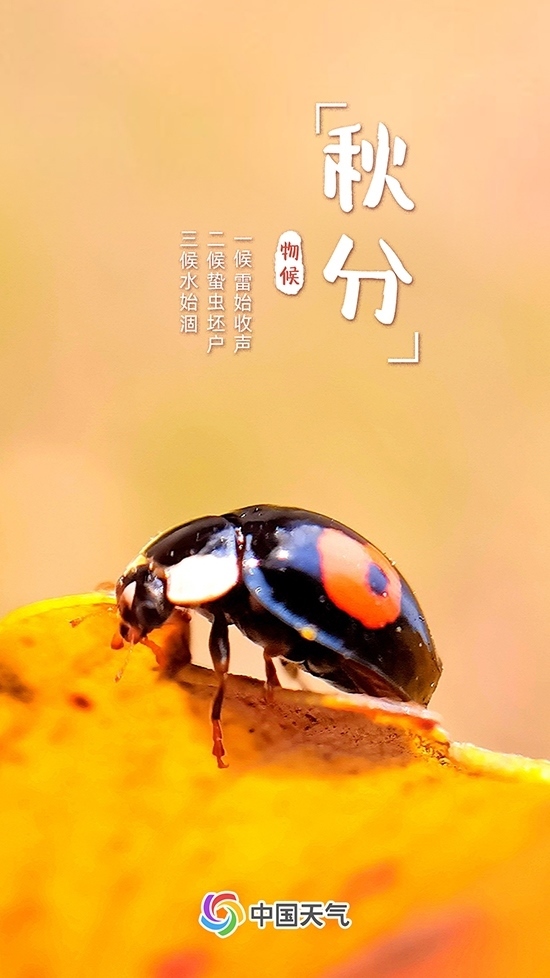 秋分有三候,一候雷始收聲;二候蟄蟲坯戶;三候水始涸。秋分時節(jié)雷聲逐漸終結,蟄居的小蟲開始藏入穴中,河流和湖泊水量變少。