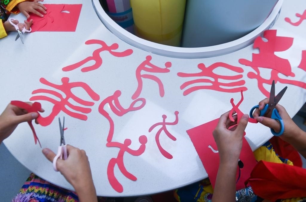 9月13日,孩子們在老師的帶領下創(chuàng)作亞運會運動項目的主題剪紙作品。新華社記者 徐昱 攝