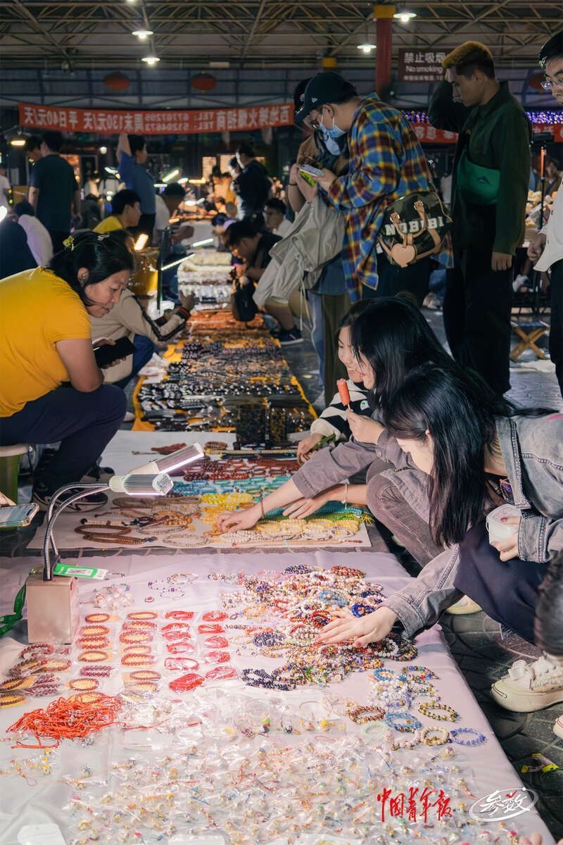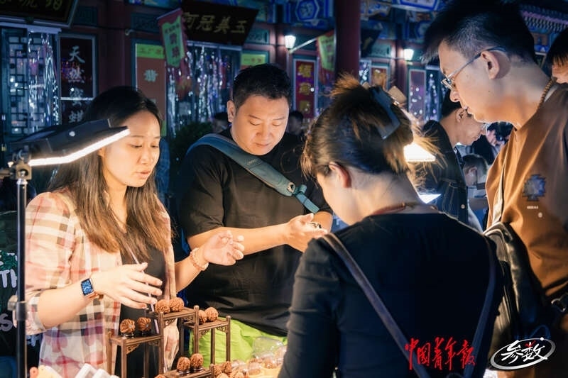夜幕降臨,北京潘家園舊貨市場內的周三夜場開啟,攤位上亮起了一盞盞照明的小燈,很多年輕人正在攤位前選購商品。實習生 邱嵐/攝