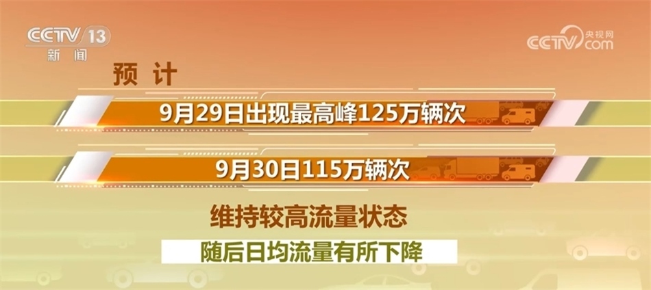 預(yù)計(jì)假期第一天,也就是今天(9月29日)出現(xiàn)最高峰125萬(wàn)輛次,明天115萬(wàn)輛次,維持較高流量狀態(tài),隨后日均流量有所下降。假期第七日和第八日路網(wǎng)流量將再度上升,且下午16時(shí)至19時(shí)易出現(xiàn)返程車流高峰。