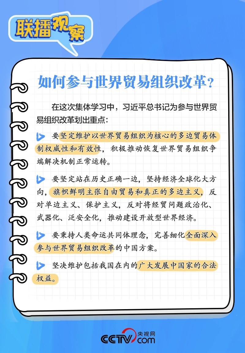 9月27日,二十屆中央政治局進(jìn)行第八次集體學(xué)習(xí),學(xué)習(xí)的主題是“世界貿(mào)易組織規(guī)則與世界貿(mào)易組織改革”。中央政治局的同志認(rèn)真聽(tīng)取了專家講解,并進(jìn)行了討論。習(xí)近平總書記在聽(tīng)取講解和討論后發(fā)表了重要講話。