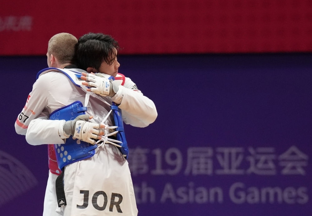 9月27日,韓國選手樸優(yōu)赫(右)在跆拳道男子80公斤級比賽后安慰約旦選手薩利赫·沙拉巴蒂。