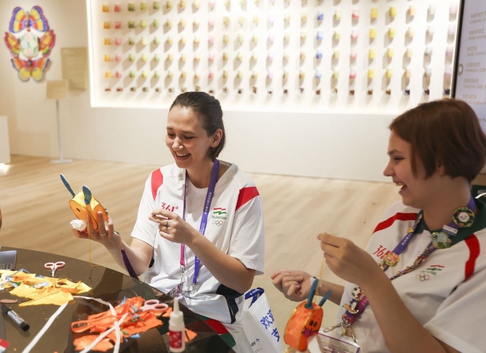 9月25日,一名日本運(yùn)動員(右)在淳安賽區(qū)傳統(tǒng)工藝體驗(yàn)坊和志愿者合影。