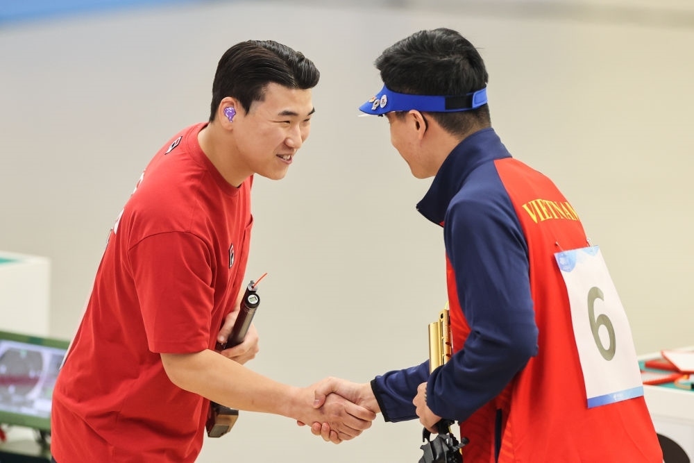 9月28日,韓國選手李元昊(左)與越南選手范光輝在男子10米氣手槍個人決賽后握手致意。??