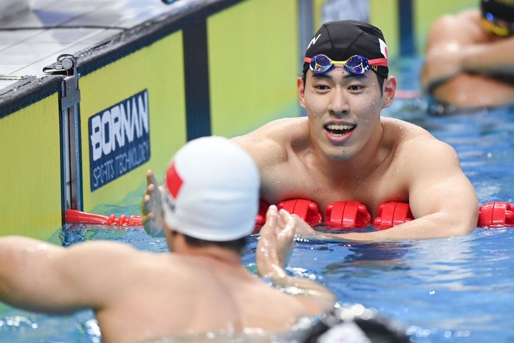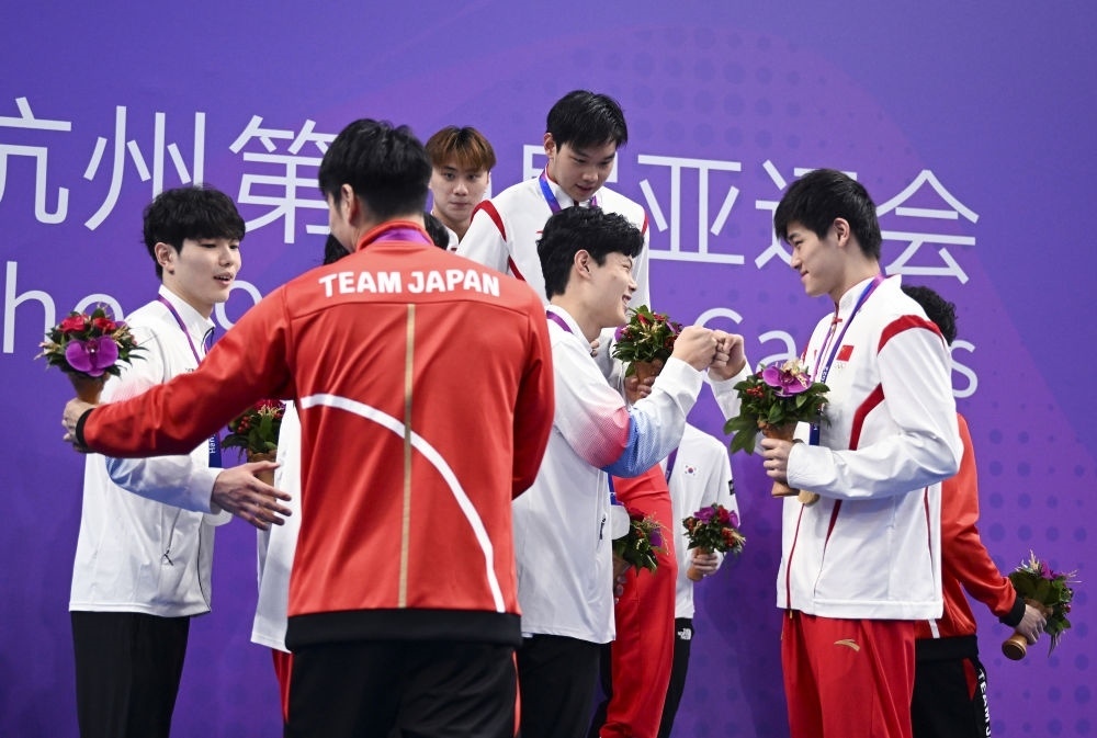 9月28日,中國隊(duì)選手在男子4X100米自由泳接力決賽后與韓國隊(duì)和日本隊(duì)選手致意。