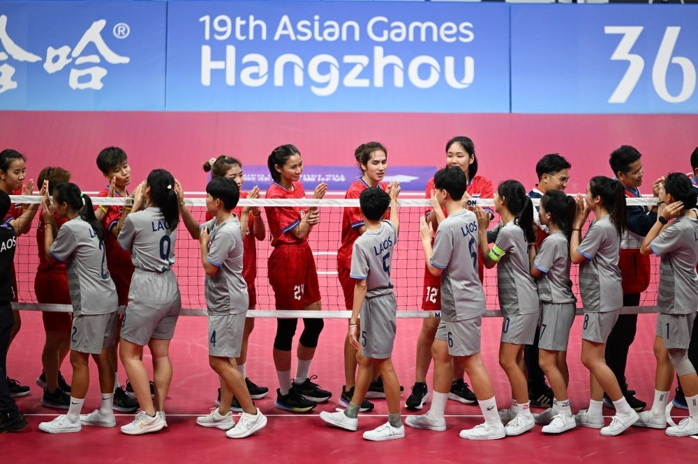 9月28日,泰國隊(duì)和老撾隊(duì)(前)在藤球女子單組團(tuán)體半決賽后互相致意。