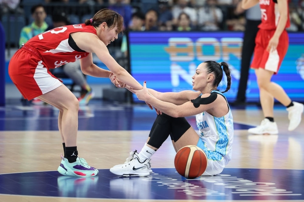 9月29日,日本隊(duì)球員宮崎早織(左)在籃球女子預(yù)賽B組比賽中拉起哈薩克斯坦隊(duì)球員阿納斯塔西婭·阿利紹斯凱特·洛帕京娜。