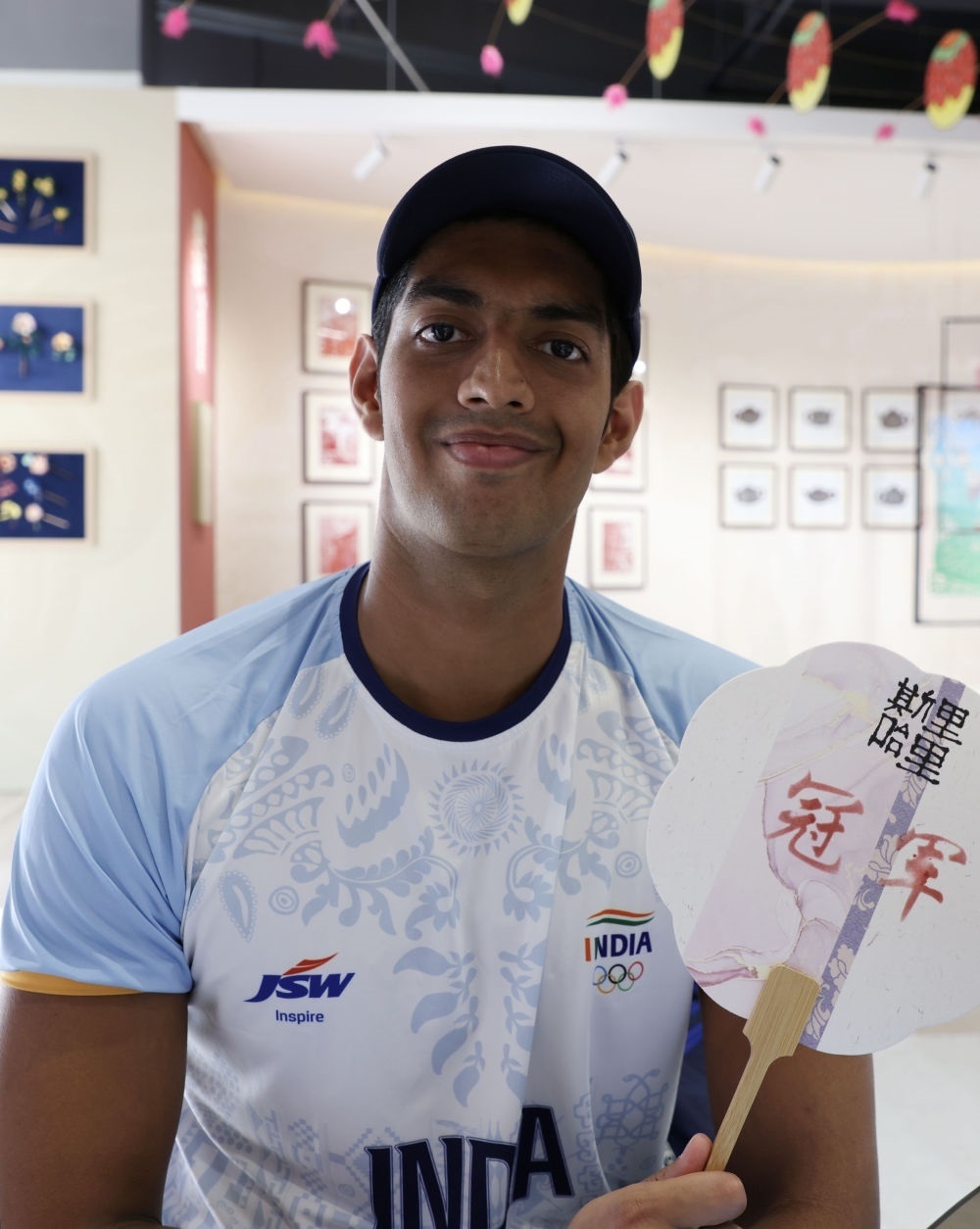 9月29日,馬爾代夫羽毛球運(yùn)動員穆罕默德·阿杰凡·拉希德(左)在亞運(yùn)村樂活集市與工作人員合影留念。