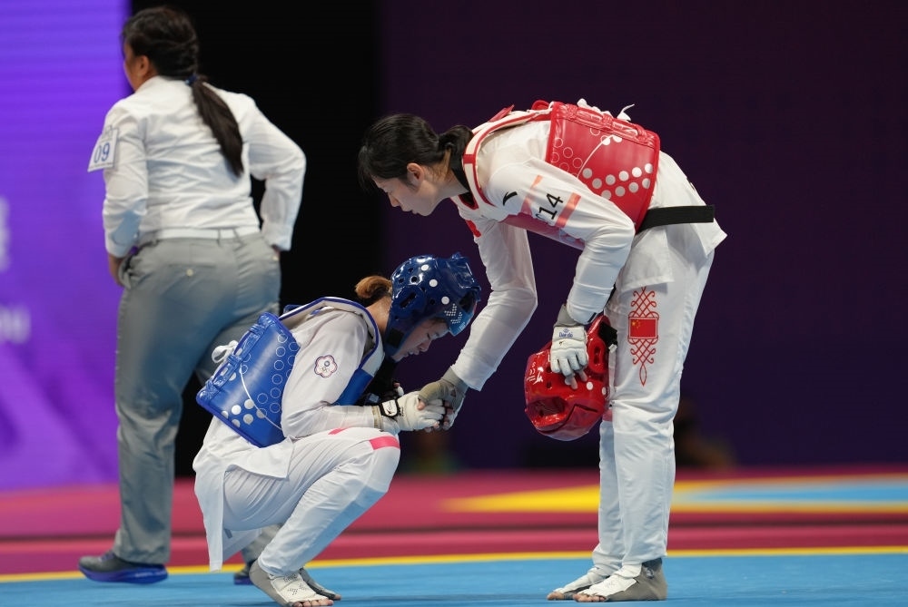 9月27日,宋潔(右)與張芮恩在跆拳道女子67公斤級1/4決賽后握手致意。