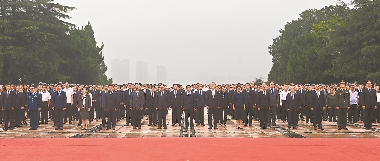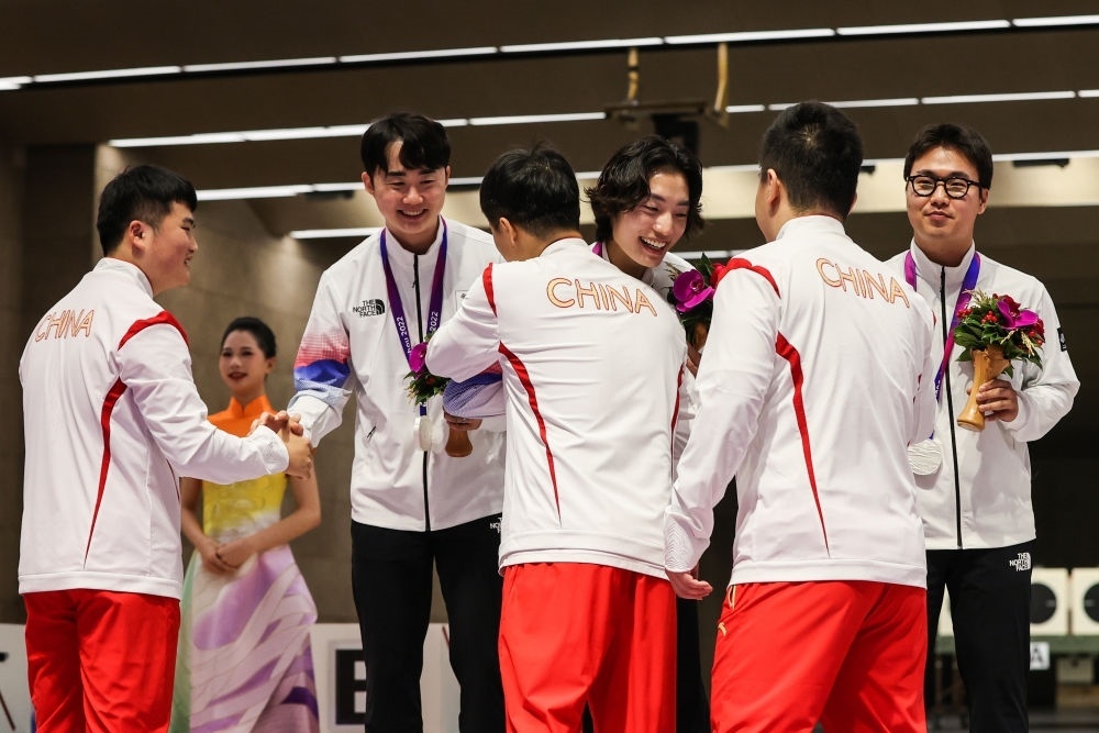 9月25日,冠軍中國隊(duì)選手李越宏(左三)、劉楊攀(左一)、王鑫杰(右二)在男子25米手槍速射團(tuán)體頒獎儀式上向亞軍韓國隊(duì)致意。