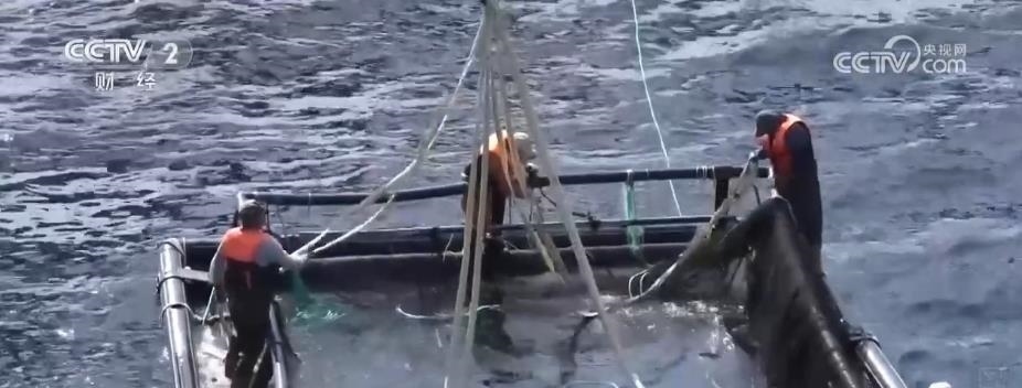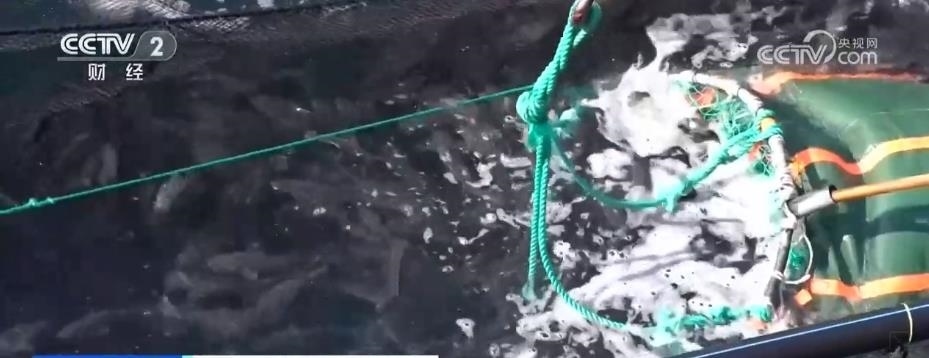 在煙臺長島南隍城海域,隨著經(jīng)海系列深水網(wǎng)箱里魚類的成熟,一場在大海上的收獲正在進(jìn)行。起降機將一個個裝滿魚兒的巨大網(wǎng)兜轉(zhuǎn)移到運輸船上,2.5萬尾近4萬斤的成品黑鲪魚,將從這里銷往全國各地。
