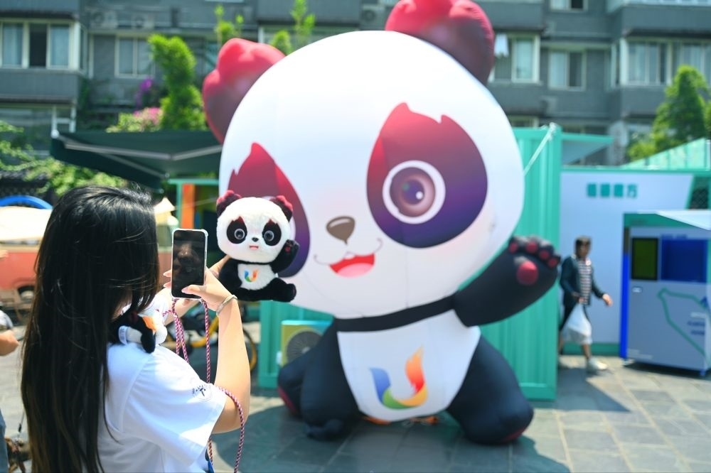 市民拿著大運(yùn)會(huì)吉祥物“蓉寶”合影。成都大運(yùn)會(huì)執(zhí)委會(huì)供圖