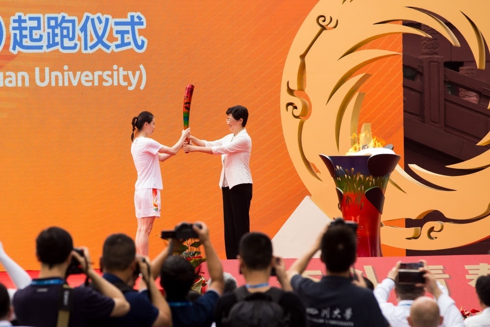 7月2日,第一棒火炬手吳敏霞(左)接過(guò)點(diǎn)燃的火炬。當(dāng)日,成都第31屆世界大學(xué)生夏季運(yùn)動(dòng)會(huì)火炬?zhèn)鬟f成都站起跑儀式在四川大學(xué)校園內(nèi)舉行。新華社發(fā)(曹鵬攝)