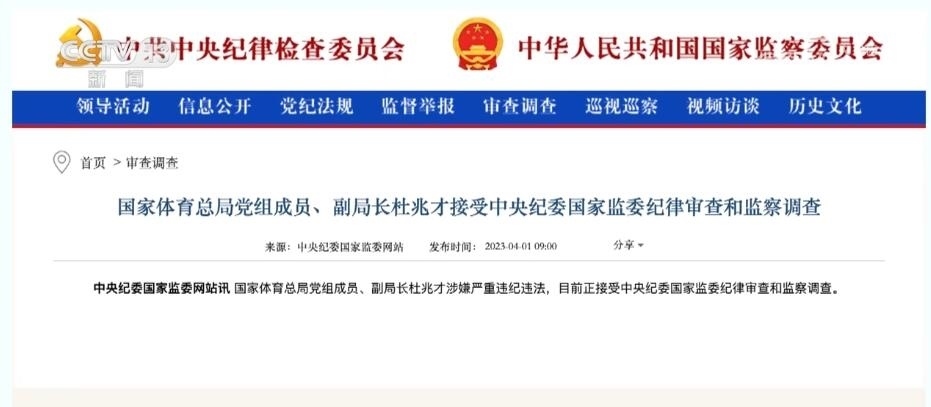 總臺(tái)央視記者 宋琎:今年3月27日,二十屆中央首輪巡視對(duì)象名單公布?!皩?duì)國(guó)家體育總局黨組開展機(jī)動(dòng)巡視”這一消息迅速成為社會(huì)熱點(diǎn)。之后不到一周,中央紀(jì)委國(guó)家監(jiān)委通報(bào),時(shí)任國(guó)家體育總局黨組成員、副局長(zhǎng)杜兆才接受審查調(diào)查。體育領(lǐng)域反腐成為今年反腐敗工作的一大重點(diǎn)。