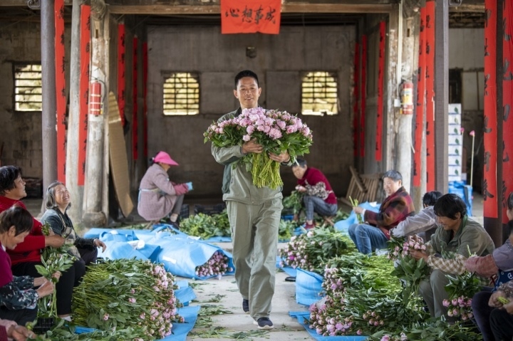 今年春天,浦江縣杭坪鎮(zhèn)烏漿村,薛勇帶著村民整理包裝采摘的芍藥花,“鮮花經(jīng)濟(jì)”帶動村民共同奔富。共享聯(lián)盟·金華中心 胡肖飛 攝