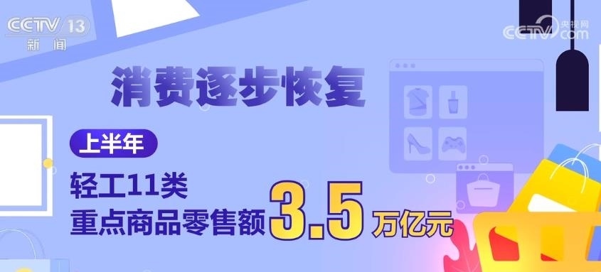 消費(fèi)逐步恢復(fù)。上半年,輕工11類重點(diǎn)商品零售額3.5萬億元,占社會消費(fèi)品零售總額的15.4%,同比增長6.3%。