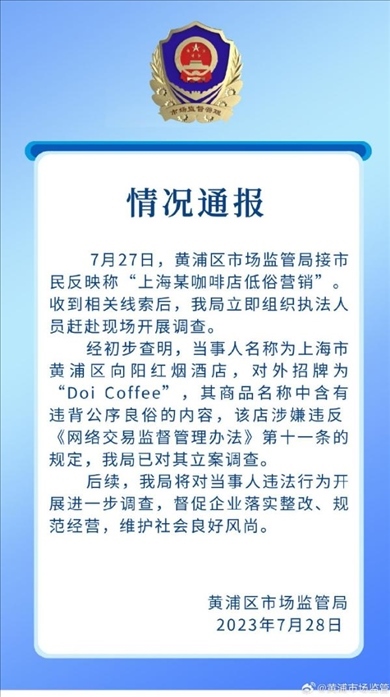 ·上海黃浦通報(bào)“咖啡店低俗營銷”:違背公序良俗,已立案調(diào)查。