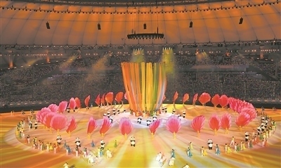 開(kāi)幕式上,“太陽(yáng)神鳥(niǎo)”穿越時(shí)空翩飛而至,4只神鳥(niǎo)圍繞旋轉(zhuǎn)的太陽(yáng)飛翔。12道金色光芒漸次點(diǎn)亮,點(diǎn)亮了整個(gè)體育場(chǎng)。